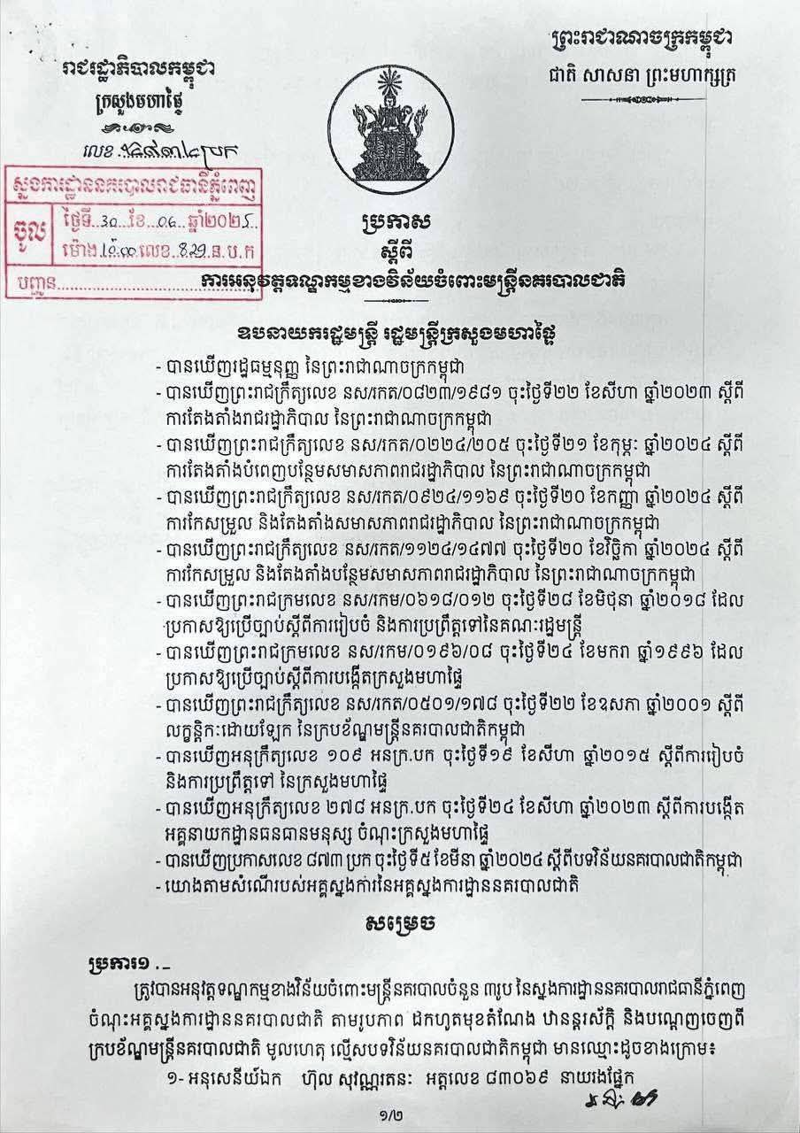 ភ្នំពេញ៖ មន្ត្រីការិយាល័យនគរបាលចរាចរណ៍ផ្លូវគោក នៃស្នងការដ្ឋាននគរបាលរាជធានីភ្នំពេញ ចំនួន០៣នាក់ បំពេញភារកិច្ច ល្មើសបទវិន័យកងកម្លាំងនគរបាលជាតិកម្ពុជា ដែលឈរជើងគោលដៅអនុវត្តច្បាប់ចរាចរណ៍ផ្លូវគោក ស្ពានអាកាសចោមចៅ ខណ្ឌពោធិ៍សែនជ័យ ហើយត្រូវបានយកមកបញ្ឈរជើងមួយរយៈ កាលពីថ្ងៃទី២៦ ខែធ្នូ ឆ្នាំ២០២៤កន្លងទៅនេះ ត្រូវបានក្រសួងមហាផ្ទៃ សម្រេចអនុវត្តវិន័យបណ្តេញចេញពីក្របខណ្ឌនគរបាលជាតិ។